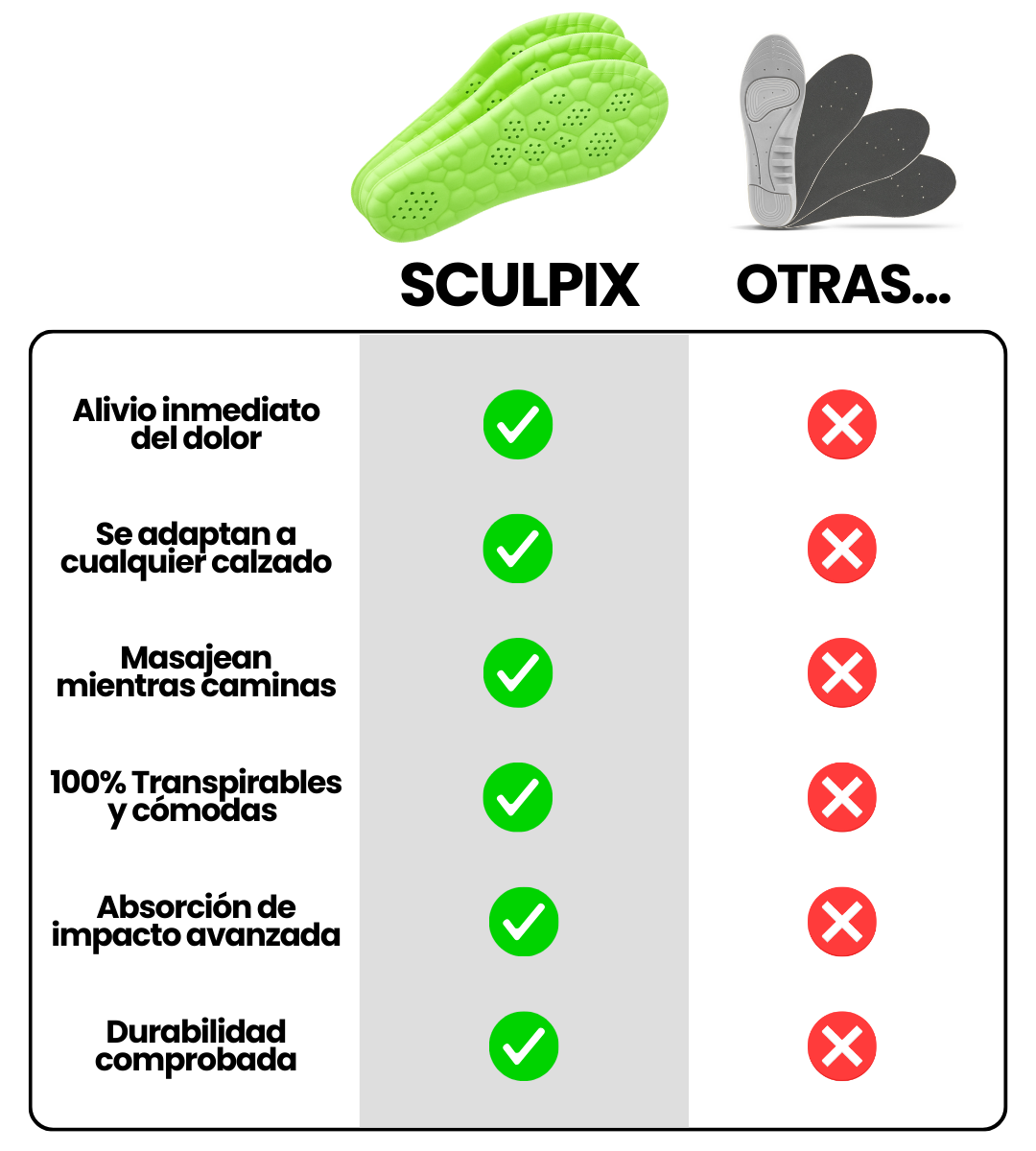 En SCULPIX diseñamos nuestras plantillas con expertos en biomecánica y podología para ofrecer un alivio real. Cada detalle está pensado para reducir el dolor, adaptarse a tu pisada y mejorar tu día a día. No es una promesa: es una solución probada.
