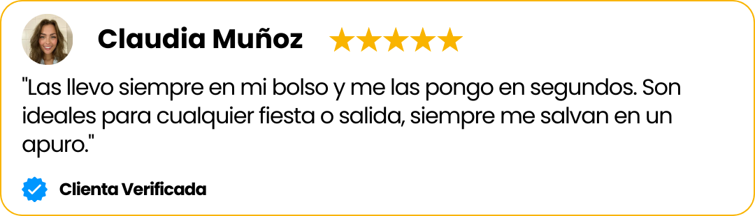 • "Siempre llevo un par en mi bolso y me las pongo en segundos. Son perfectas cuando necesito un toque de glamour rápido. Las recomiendo totalmente."